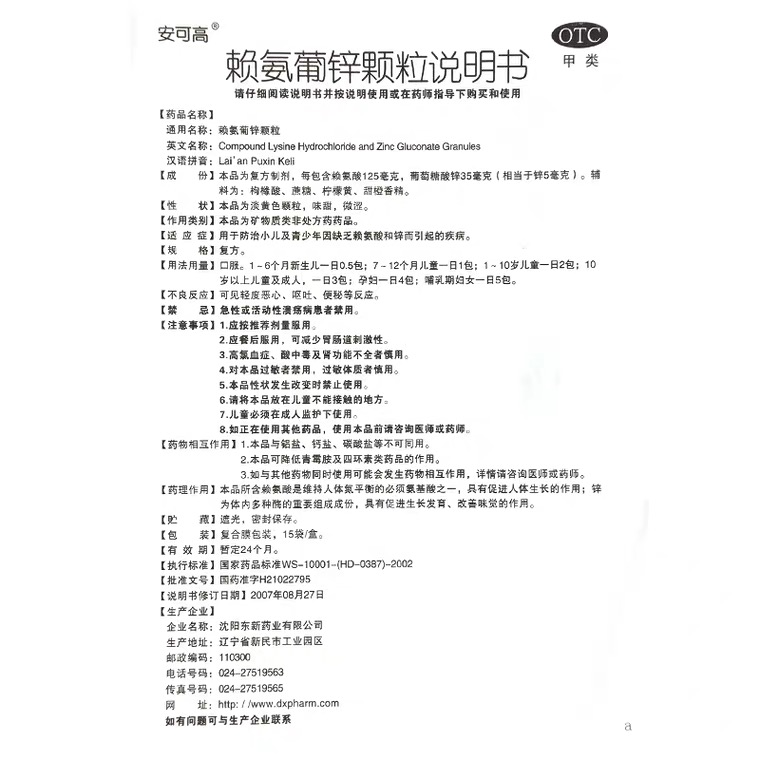 成分:本品的主要成分为每袋含盐酸赖氨酸125mg、葡萄糖酸锌35mg(相当于锌5mg)