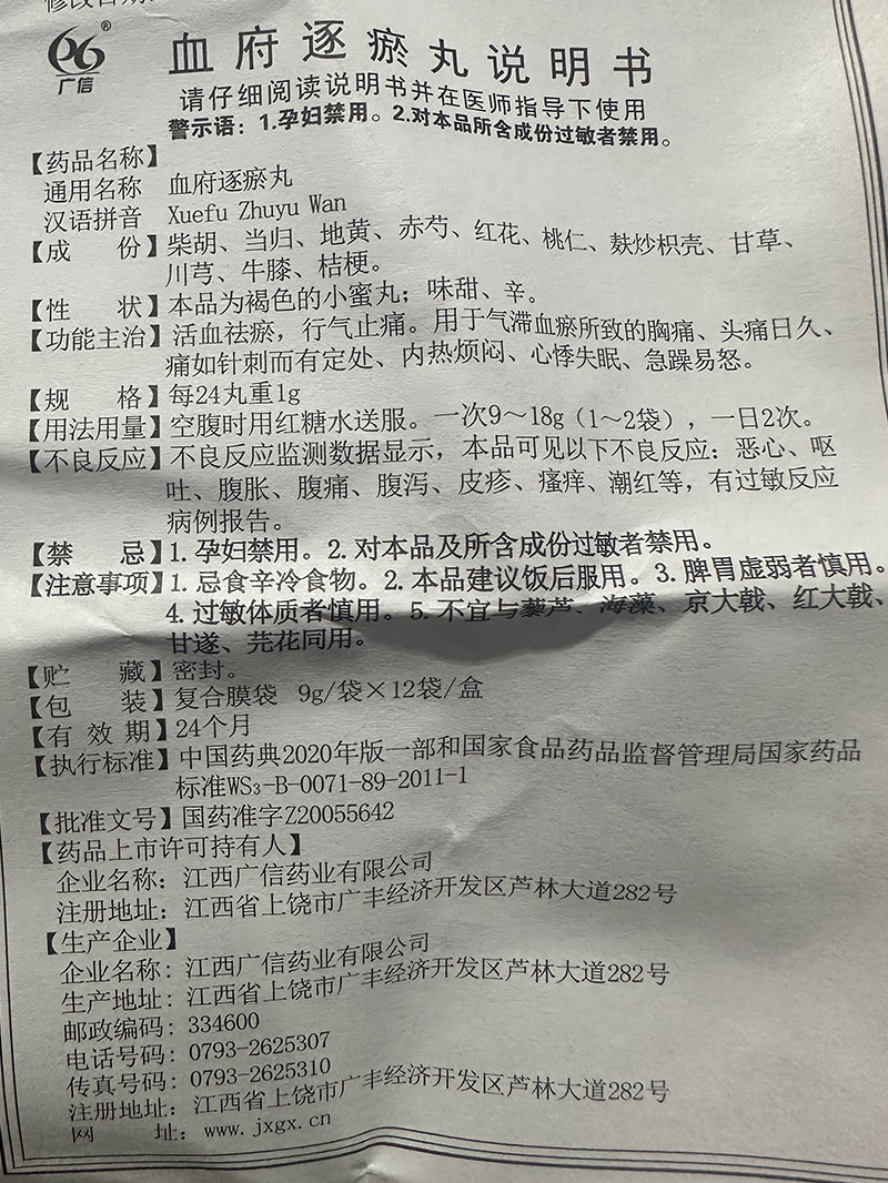 功能主治: 活血祛瘀,行气止痛。用于瘀血内阻,头痛或胸痛,内热瞀闷,失眠多梦,心悸怔忡,急躁善怒。