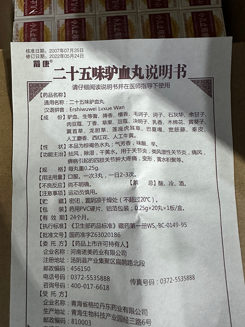 [成 份] 驴血、生等膏、降香、檀香、毛诃子、诃子、石灰华、 余甘子肉豆、丁香、草果、豆、决明子、乳香、木棉花、黄葵子、翼首草龙胆草、莲座虎耳草、巴夏嘎、宽筋藤、秦皮、人工麝香、西红花、人工牛黄。