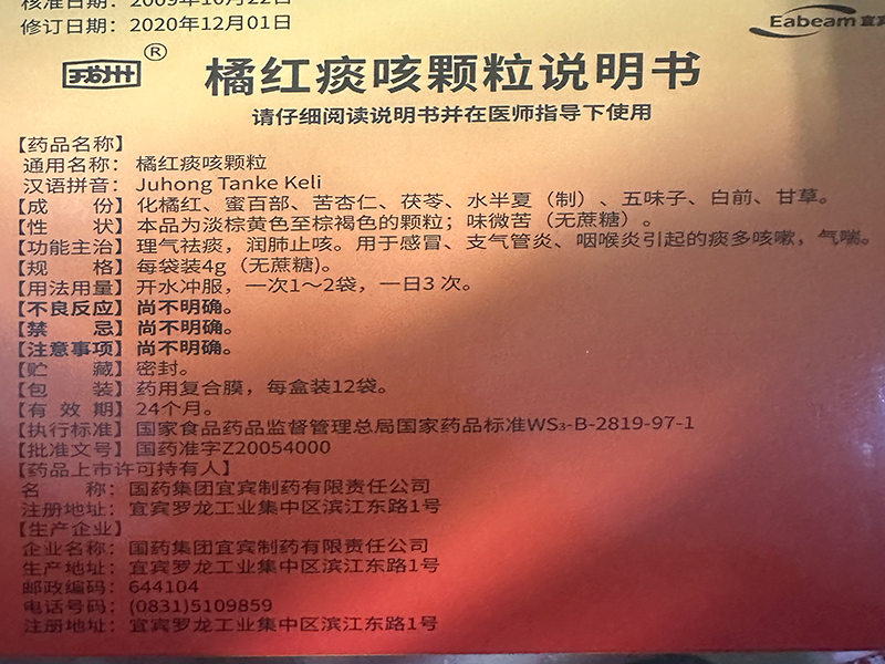 [成份]化橘红、蜜百部、苦杏仁、、水半夏(制)、五味子白前、甘草。