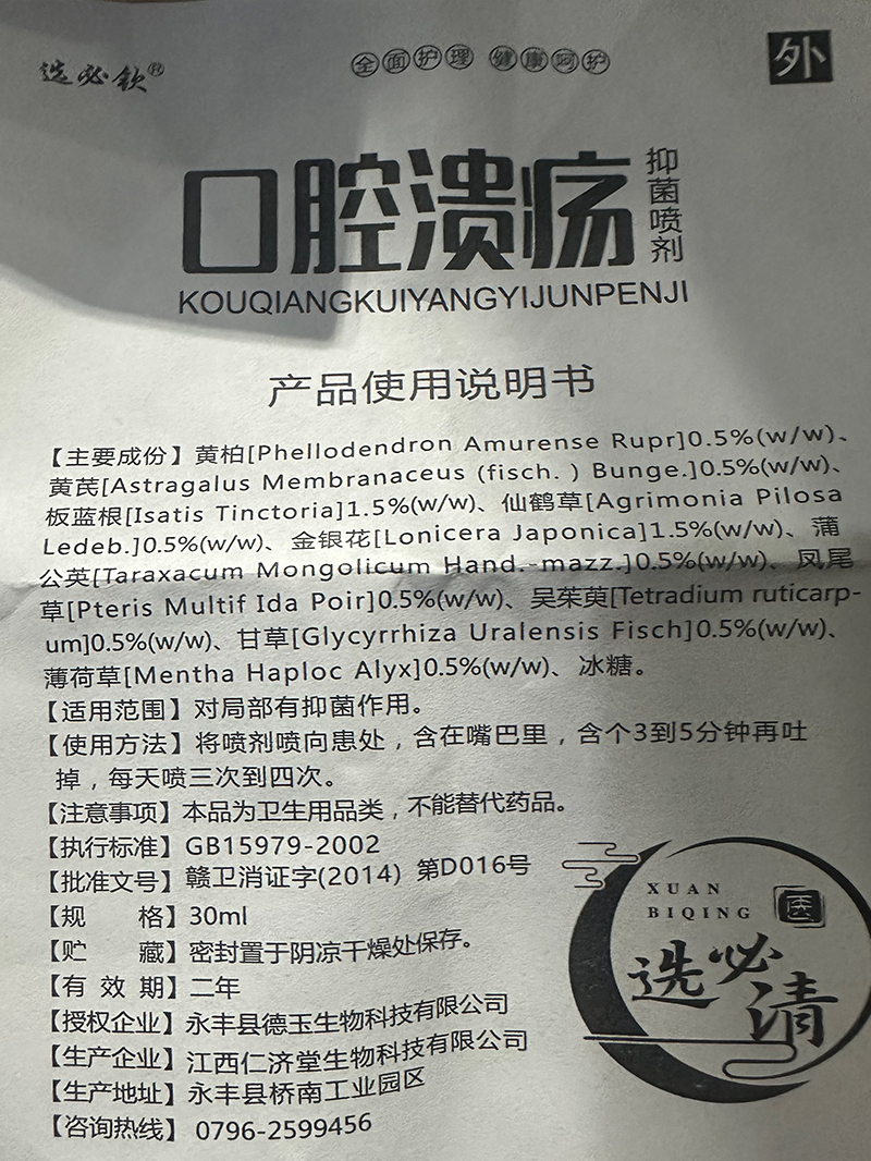 (成份]黄柏、黄、板蓝根、仙鹤草、金银花蒲公英、凤尾草、吴莱英、甘草、薄荷草、冰糖。