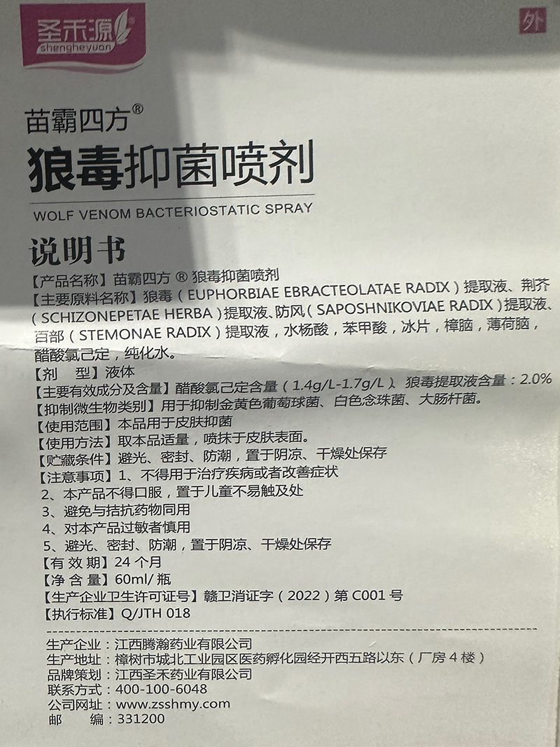 (主要有效成分及含量]醋酸氯已定含量(1.4g/L-1.7g/L)狼毒提取液含量:2.0% [使用范围] 本品用于皮肤抑菌 [使用方法] 取本品适量,喷抹于皮肤表面