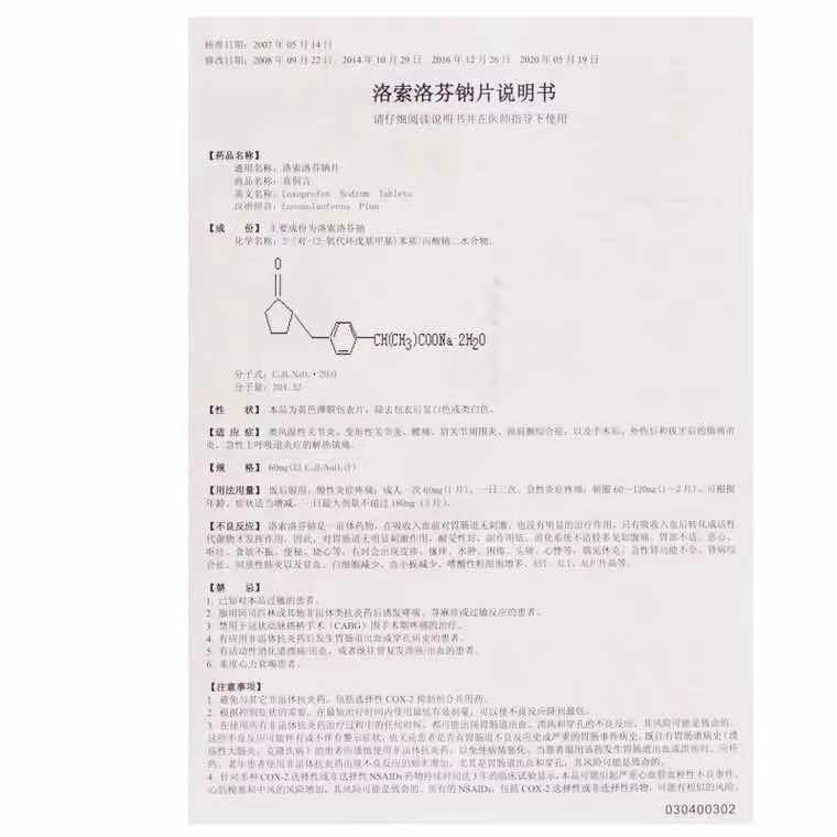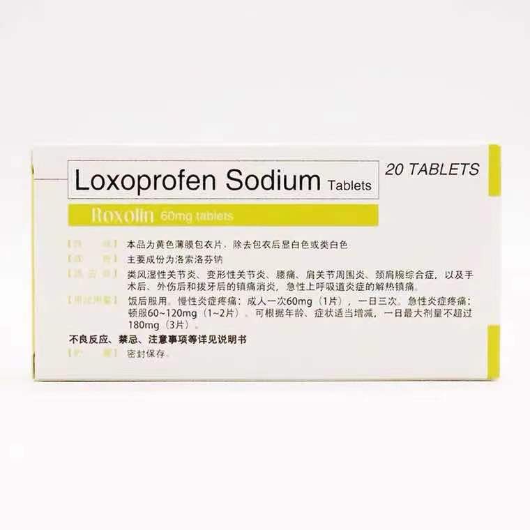 用法用量: 成人1次口服洛索洛芬钠(以无水物计)60mg